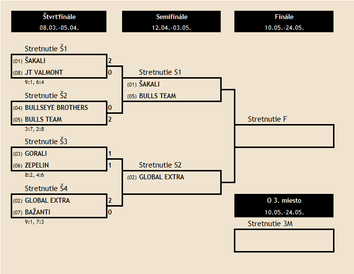 Gorali - Zepelin 8:2, Relaks - JT Valmont 5:6p, Bulls Team - Podháj Darts Club 8:2, Bullseye Brothers - Bažanti 8:2 |